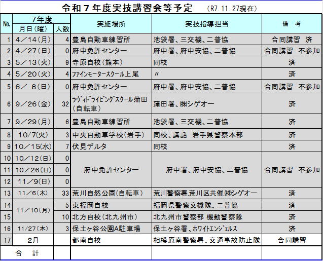 10/12(日)、10/26(日)、11/9(日)実技講習会(会場:府中運転免許試験場、指導:警視庁府中警察署・府中交通安全協会・日本二普協)の御案内 |
